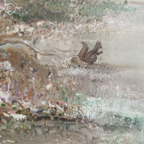 This favorite has two cute animals, one curious squirrel and one foxcub. Both animals are rarely seen and you become very glad when discovering them, here in a fairytale dreamland with pastel colours of green, blue, pink and over ten other colours in a lovely scenery. This painting has a champagne shimmer that shines lovely in daylight, which makes the beautiful painting appear warmer.